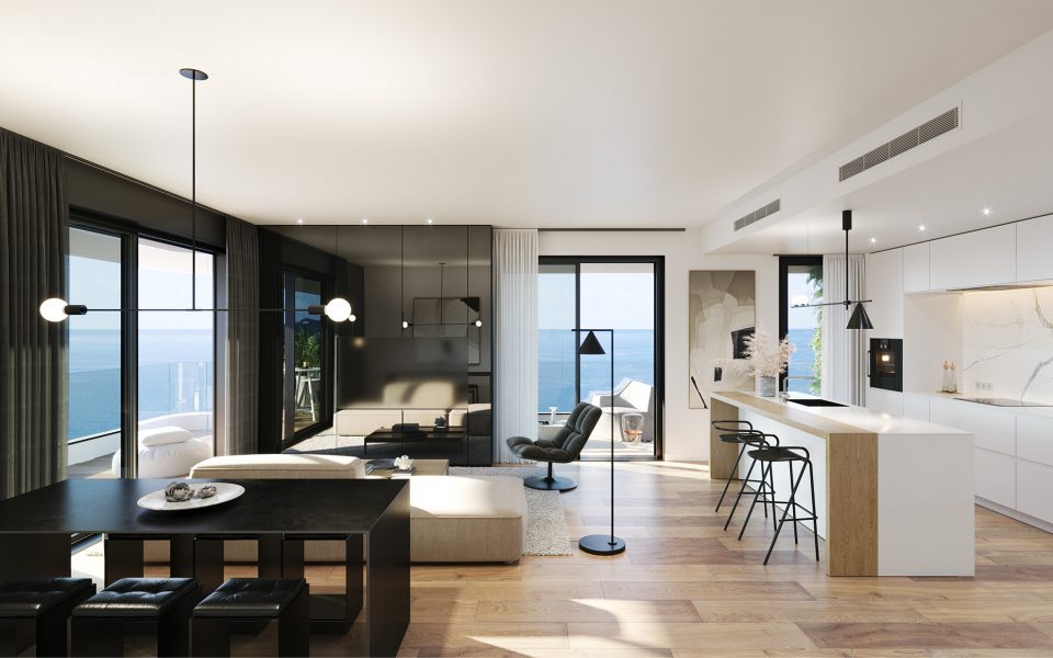 Eteric Residencial està format per dos edificis de 7 i 15 plantes, amb vistes impressionants a la mar Mediterrània. Un estil arquitectònic cuidat que s’adapta a l’entorn on s’alcen els 2 edificis d’habitatges a primera línia de la platja de Ponent.